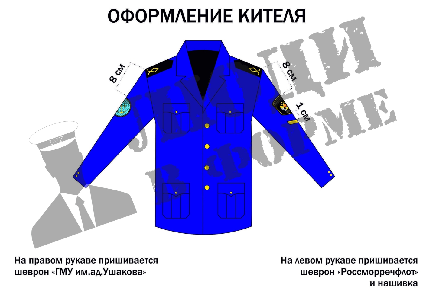 Обращаем внимание, что погоны должны быть пришиты. Если требуется по правилам ношения установить якоря, то следует сделать это заблаговременно. Шевроны и курсовка также пришиваются к кителю, а не клеятся на клей. С каждым курсом количество желтых галочек увеличивается, шеврон с пердыдущим курсом отпарывается, нашивается новый.